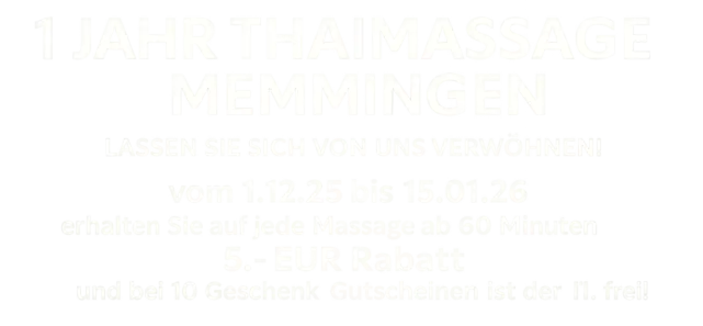 Freuen Sie sich auf eine echte, traditionelle Thai Massage in Memmingen – oder Nuad Thai, wie die Massage in meinem Heimatland heißt. Sie wird als Methode zur aktiven Gesundheitsvorsorge angesehen, die sowohl die Flexibilität des Bewegungsapparates als auch das seelische und körperliche Wohlbefinden fördern kann. Sie sorgt für Entspannung und Wohlbefinden.